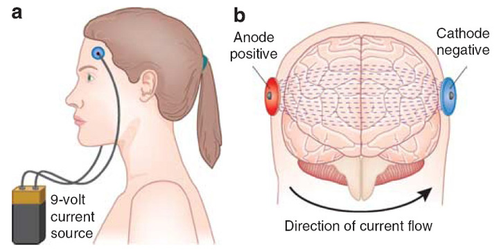 Figure 5 (George & Aston-Jones, 2010). A tDCS device uses an anode and cathode connected to a direct current source much like a 9 V battery (a). The direct current passes through the intervening tissue, with some shunting through the skull but much of it passes through the brain and changes resting electrical charge, particularly under the cathode (b).Crinion started her talk by saying she originally wanted to use transcranial magnetic stimulation (TMS) -- another non-invasive brain stimulation technique -- but this would be too painful if applied over the left inferior frontal cortex (Broca's area). She lamented the NHS limit of 12 hours of speech therapy for stroke patients with aphasia. These individuals would benefit from more intensive therapy (e.g., phonemic cueing) for a longer period of time. From a practical standpoint, then, would tDCS maximize the results obtained during a truncated retraining period?1 What sort of behavioral and neural effects might be expected with such a regimen?